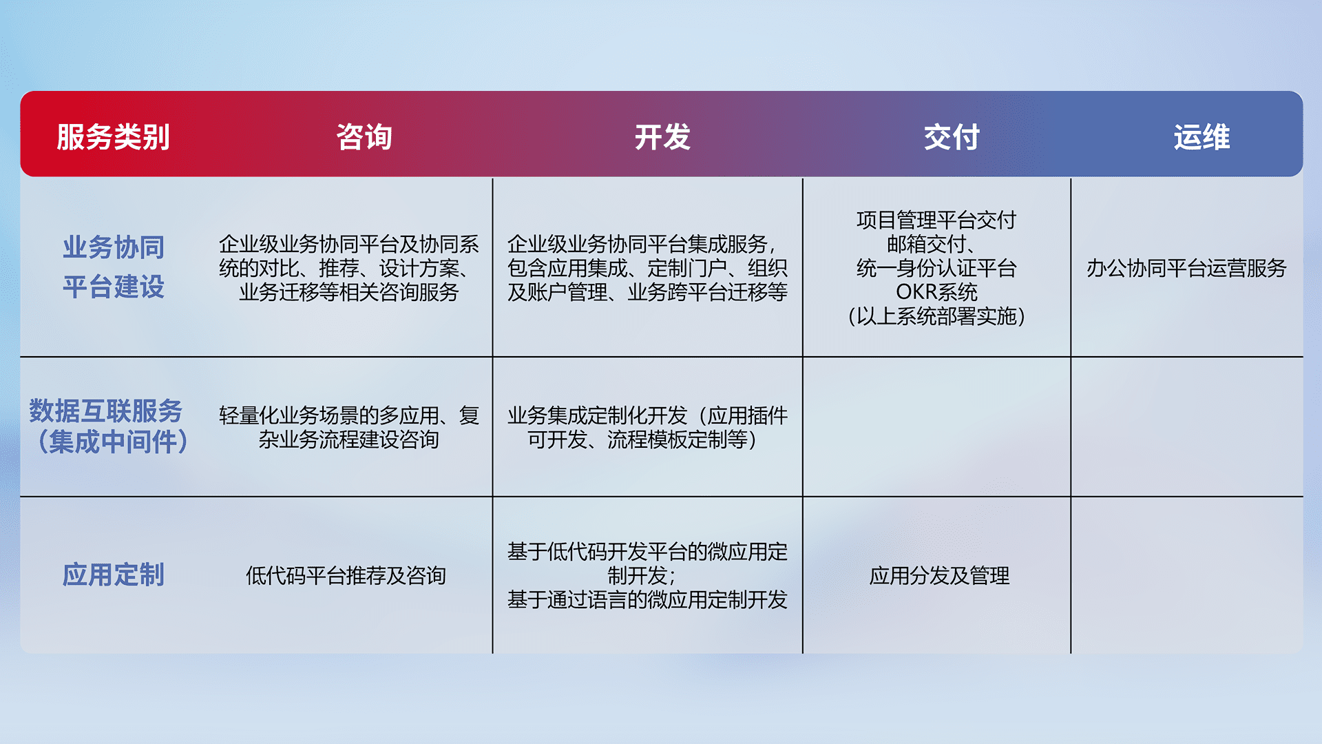 针对钉钉、、、、企微、、、IDaas等平台级产品提供产品的规划、、、方案、、交付、、、定制化开发等服务,,实现如统一协同办公、、、、智能客户服务、、、混合会议管理、、、智能数据查询、、等业务场景,,实现数字化转型。。