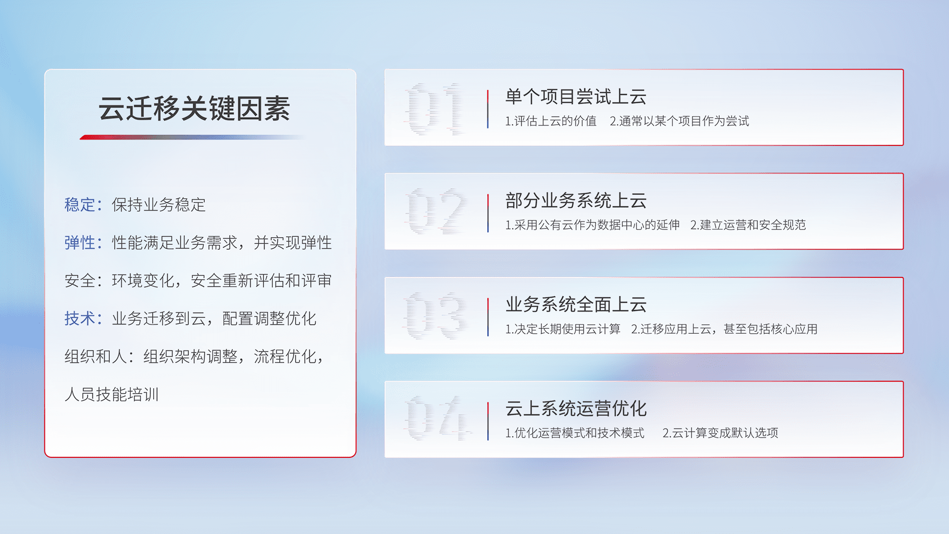 结合实际业务,,,从规划设计、、、、云平台选型、、云原生改造、、数据迁移、、集成交付,,,,迁移全过程为客户识别最佳上云路径,,做好风险识别管理,,,设计网络架构、、、身份权限、、、、安全审计合规、、、、操作审计、、、日志审计、、监控告警策略、、、、多站点容灾设计等,,对云上基础设施进行整体规划,,提升IT治理水平,,以满足弹性、、高可用、、、、高性能的需求。。。。