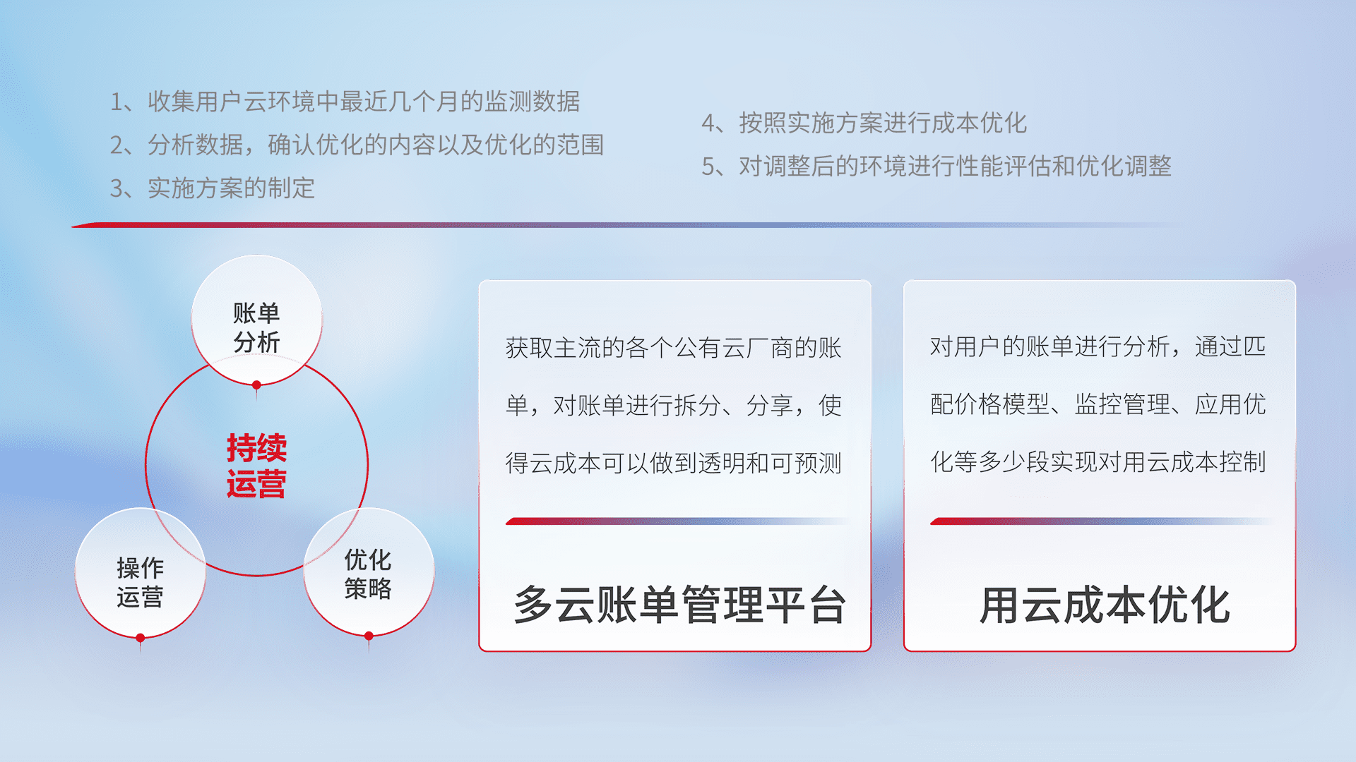 通过多云纳管,,,以统一的资源数据模型把客户的云资源进行抽象和封装,,进而实现对多云资源的统一操作,,保障云资源管理的可靠性、、、稳定性与可用性。。量身定制化运维内容,,,,配置、、、开发运维、、、、补丁管理、、、、备份、、、、监控、、认证和访问管理、、、、审计和日常巡检等,,,保障在用云过程中的可靠度,,,,稳定度以及高可用率。。