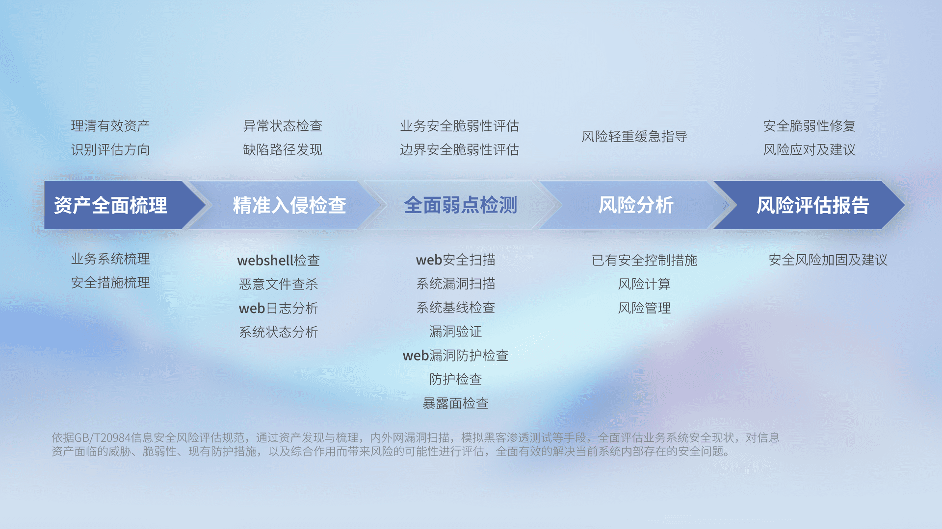 针对客户行业特性,,以专业的安全服务+多厂商联合解决方案提供专属的一站式安全管理服务,,帮助客户全面感知网络空间威胁,,基于识别、、、、检测、、分析、、、、防护、、、监测、、、响应的服务理论模型,,从方案咨询、、、集成交付、、评估验证、、、优化加固、、、、运维运营,,,,致力于为客户提供完整的闭环管理式安全服务。。以实战经验为客户打造高抵御风险的安全体系,,,帮助客户发现威胁、、、、对抗威胁、、处置威胁,,,不断积累安全对抗能力,,持续保障数字化安全。。。